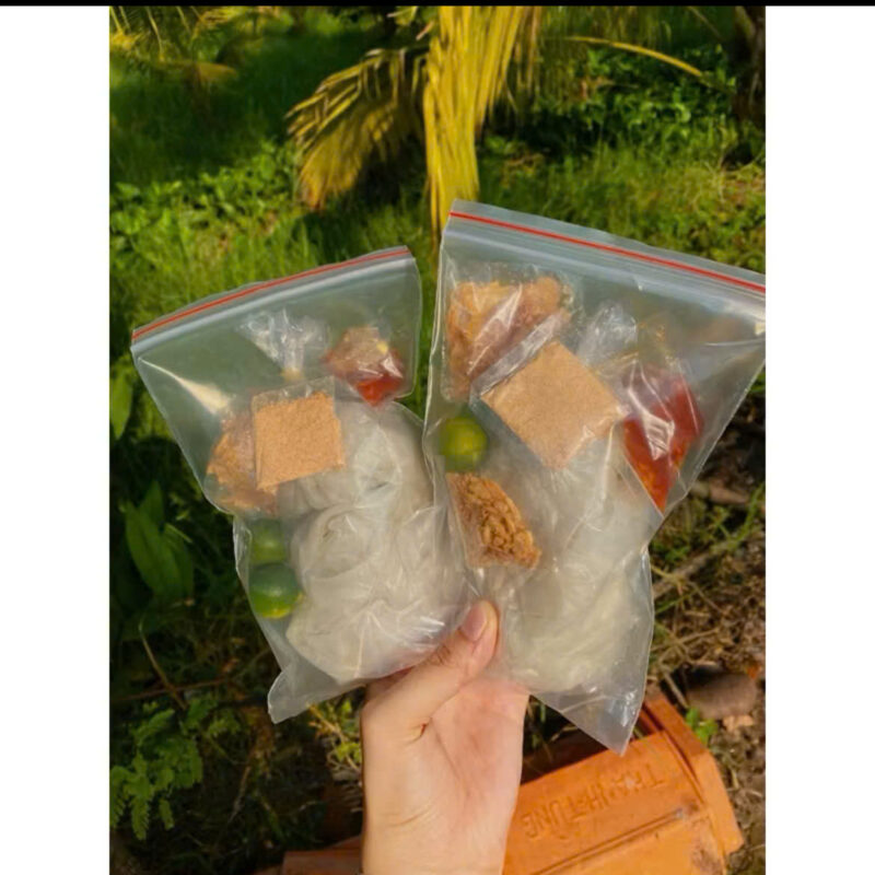 • Thành phần: Bánh tráng cắt sợi, xoài, trứng cút, bò khô, đậu phộng, nước sốt.