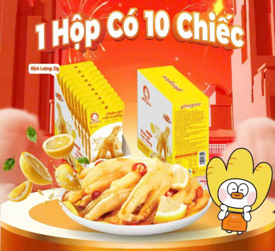 - Mô tả sản phẩm: Chân gà dai giòn đã được rút xương. Vị ngọt chân gà cùng mùi sốt thơm khó cưỡng chắc chắn sẽ khiến bất kỳ ai khó tính nhất cũng phải ngất ngây. Được tuyển chọn từ những chiếc chân gà to bự, thịt chắc, ngon giòn sần sật kết hợp với công thức chế biến nước sốt đậm vị truyền thống. Từng chiếc chân thấm đẫm gia vị, màu sắc bắt mắt khiến ai cũng mê mẩn, ăn một miếng là không thể dừng lại.